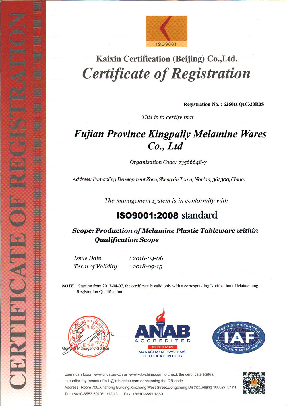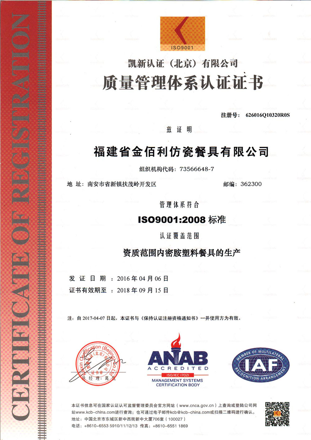 Certificate of Quality Management System (English)